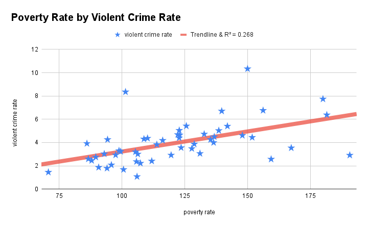 The chart above is called a scatterplot (an especially cheeky, patriotic one thrown together in Google sheets). Each “star” is a data point corresponding to a state in the United States. On the x-axis (horizontal-axis) is the 2020 poverty rate per 100,000 people (from U.S. Census Bureau); on the y-axis (vertical-axis) is the 2020 violent crime rate per 100,000 people (from FBI UCR program). The line goes by different names depending on context, but one name is the trendline. An apt name because it is a line…that captures a trend…
