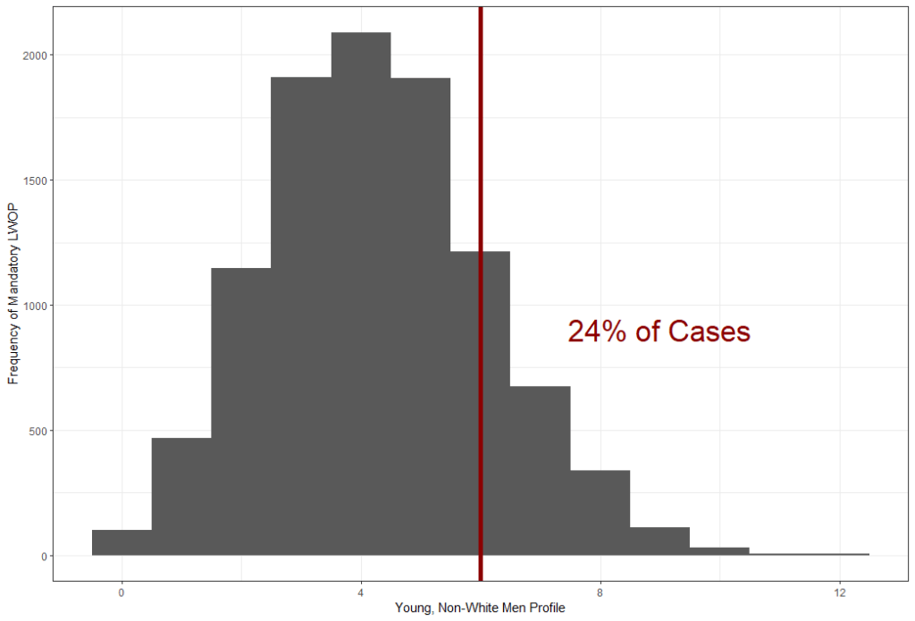 Under the null distribution, there is an almost 1 in 4 chance that 6 or more cases with the young, non-white men profile would result in a mandatory LWOP sentence. With a conventional alpha level of .05, this indicates a failure to reject the null hypothesis. There was a failure to reject the null hypothesis for this profile, but for all other profiles as well. The conclusion would be that the probability of a defendant convicted of at least one murder and eligible for LWOP receiving a mandatory LWOP sentence is independent of age, race, and gender (as crudely measured here).