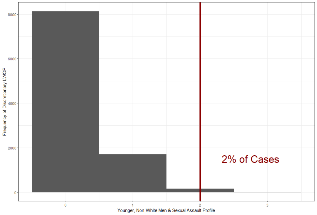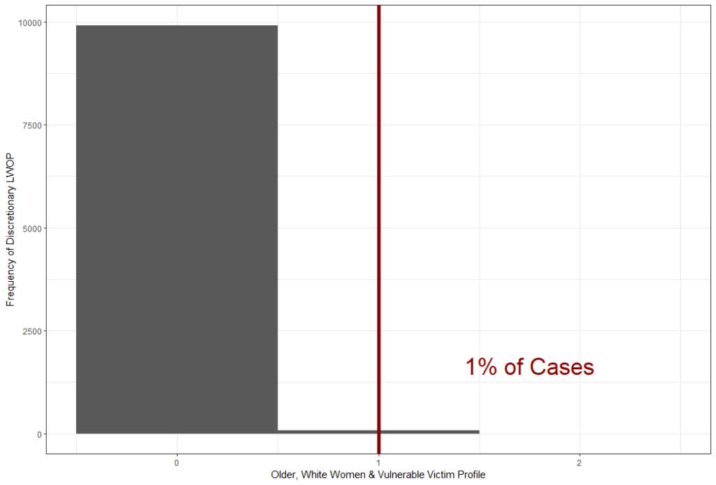 The same story played out for the comparison of discretionary LWOP to virtual LWOP. However, when I added aggravating factors, multiple victims (i.e., murder of one victim and attempted murder of another), sexual assault, and “vulnerable” victims (i.e., children or senior citizens), a different story played out. Three profiles were statistically significant–two if two-tailed tests were used. The charts below are for the younger, non-White men and sexual assault profile, the older, White women and vulnerable victim profile, and the older, White men and vulnerable and multiple victims profile.